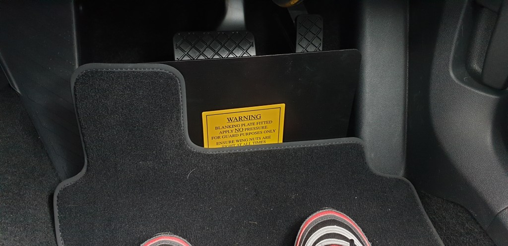 The blanking plate is fixed in place by wing nuts, and stops my feet touching the pedals and activating or blocking them. It’s easily removed for Sarah to use the pedals as normal.