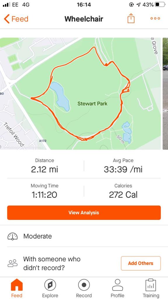 Two laps of Stewart Park today, as evidenced by my new best friend Strava. Who knew I had it in me?! Well, I know one person who knew: Alex, my awesome PT. Today she did something really cool other than coming out in the rain with me; she did a lap in a wheelchair! Now, whilst that may sound a bit strange, it’s actually brilliant. As someone with no experience of a spinal cord injury, Alex cannot understand what everyday tasks like pushing around a park are like, nor can she understand what it’s like to have to move your legs in and out of bed by hand. Whilst the second part is extreme, the first part is not, and she decided to do something about it!